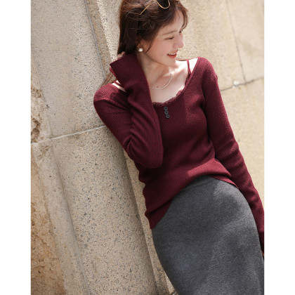 【窈窕日常】秋季蕾丝拼接U领线衫修身短款含绵羊毛针织衫女上衣