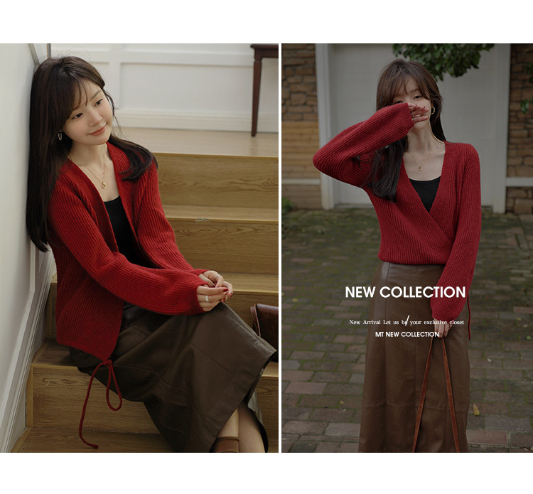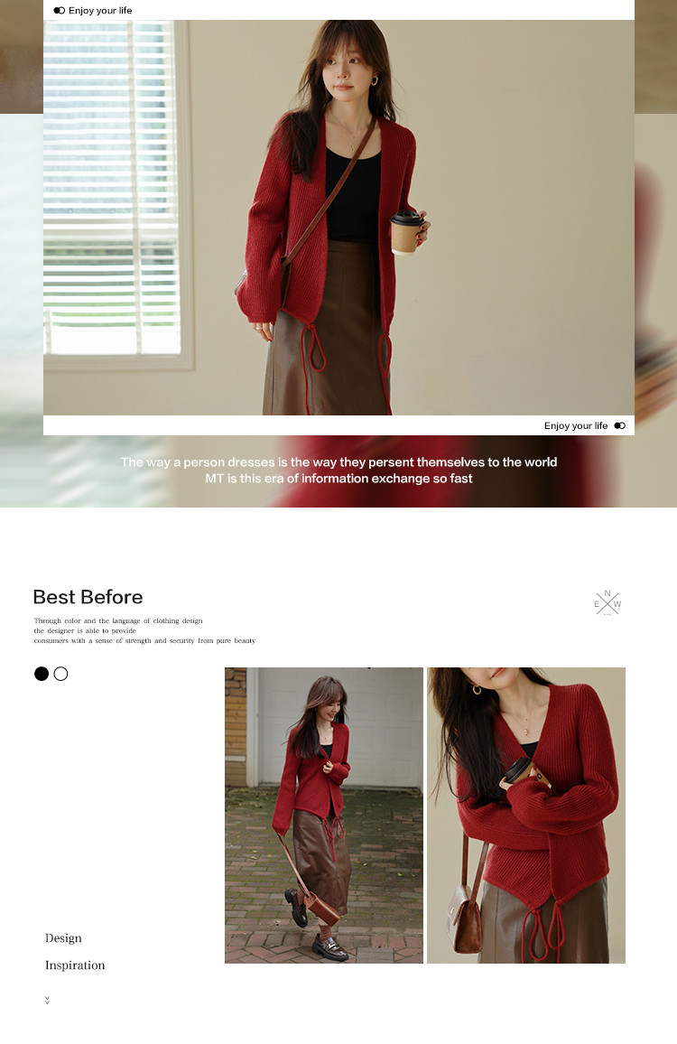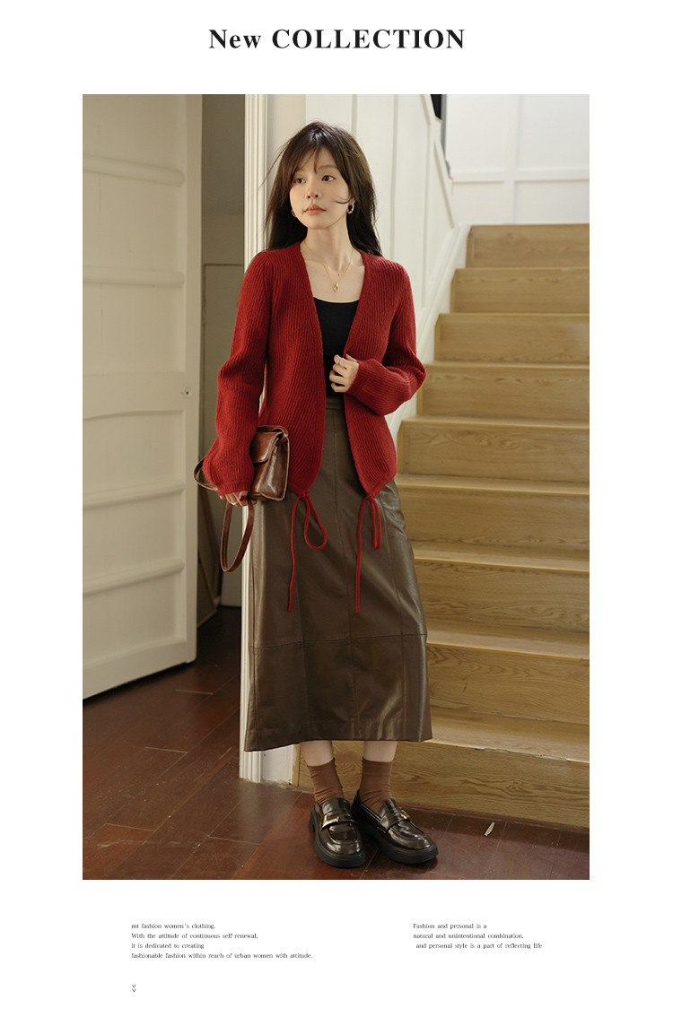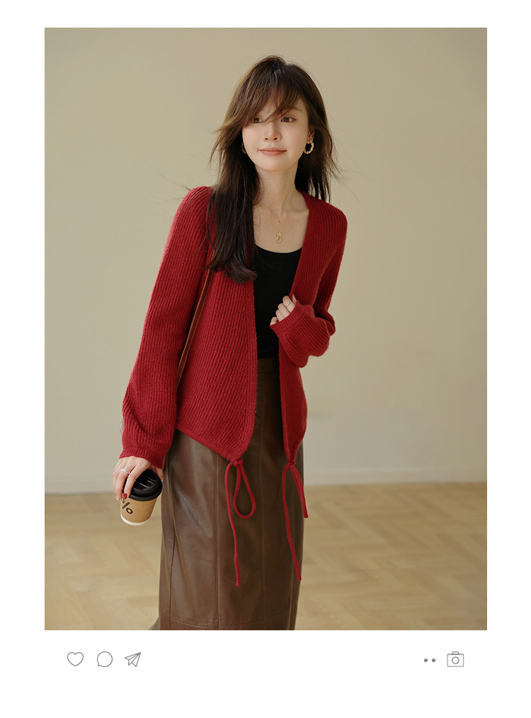 【简系都市】秋复古慵懒V领系绳长袖开衫舒适藏肉针织衫女上衣
