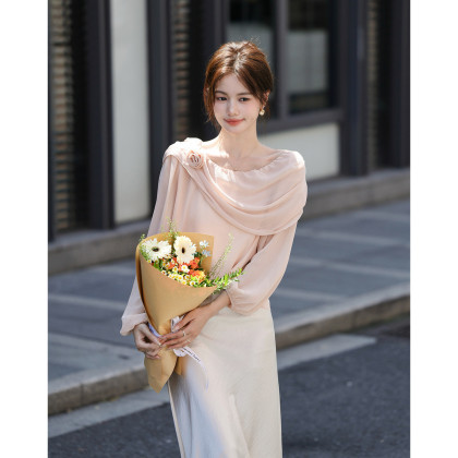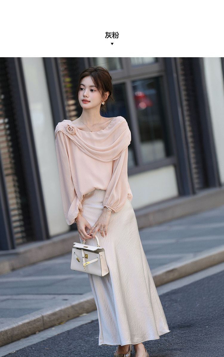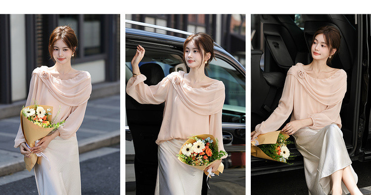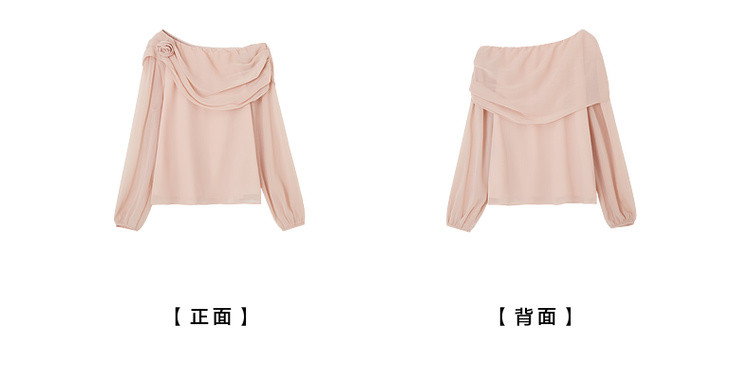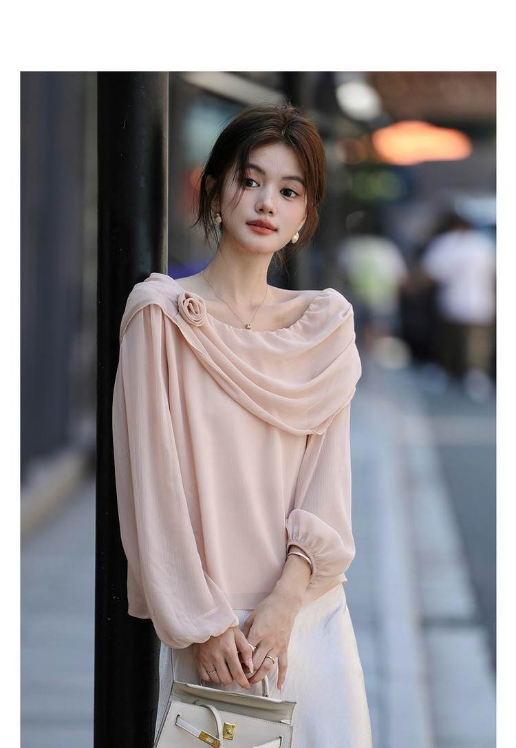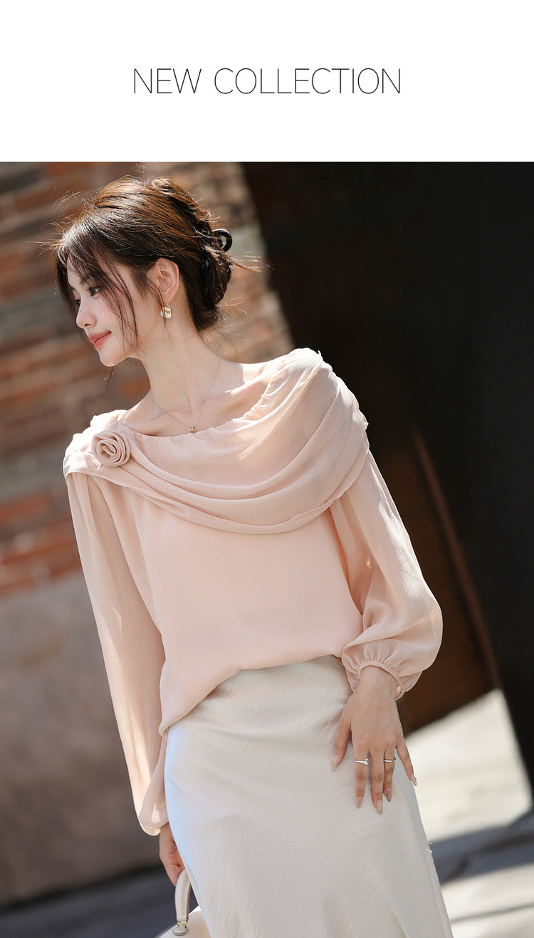 【温柔印象派】秋季气质名媛斜荡领衬衫花朵装饰轻薄衬衣女装上衣