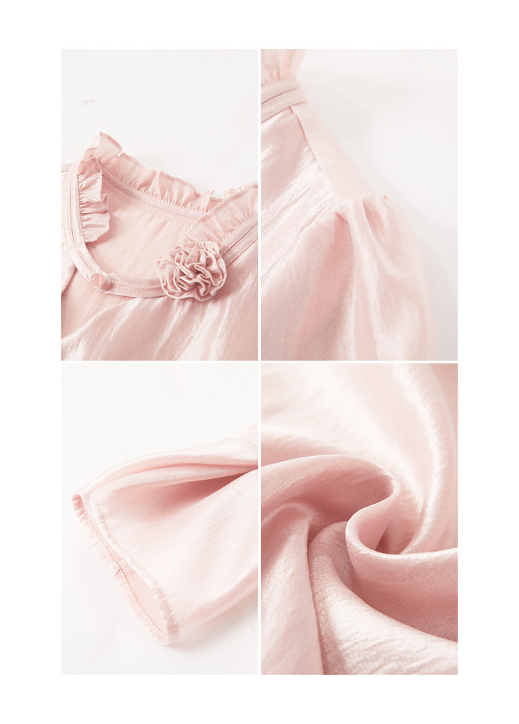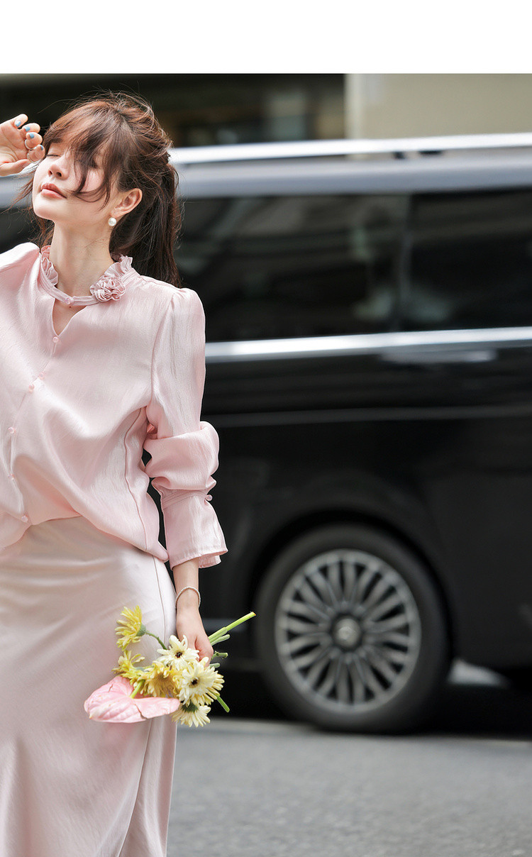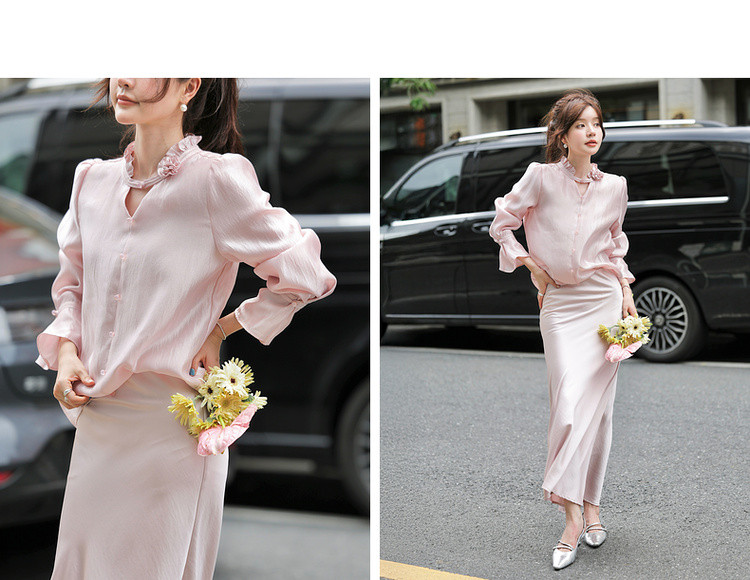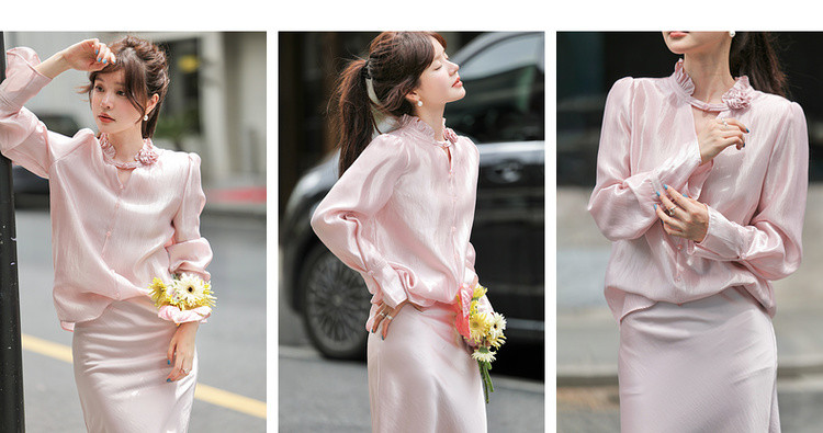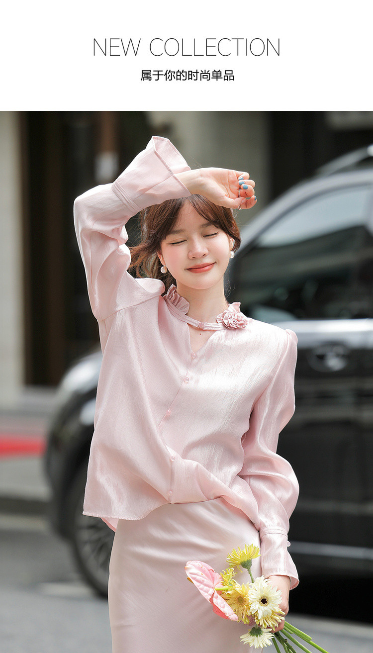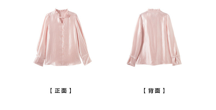 【奢感莱赛尔】秋季静奢通勤花朵装饰立领衬衫泡泡袖衬衣女装上衣