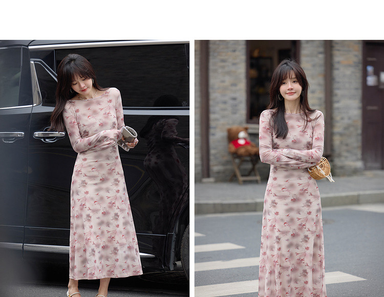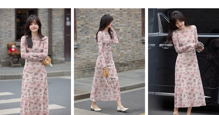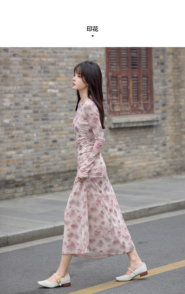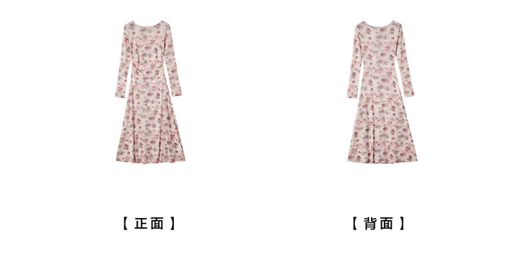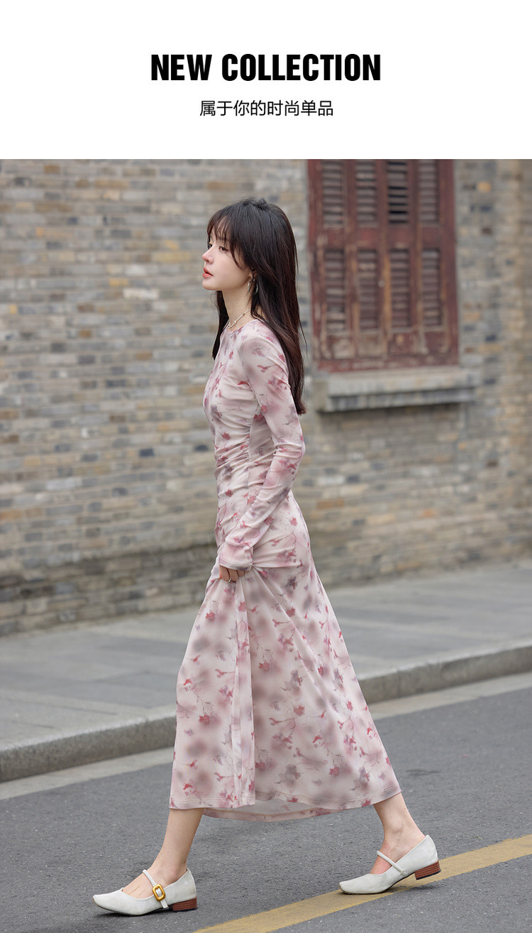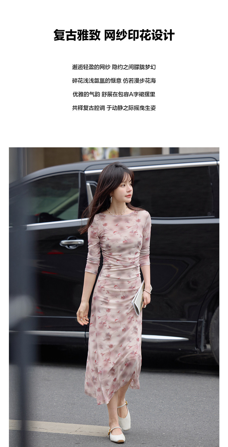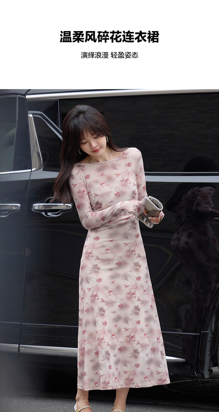 【繁花协奏】秋季温柔风印花圆领含吊带收腰舒弹连衣裙女长款