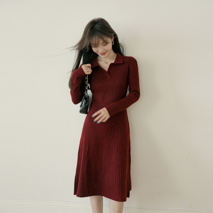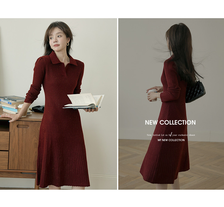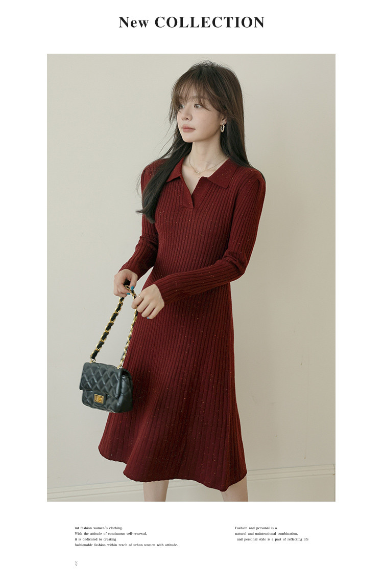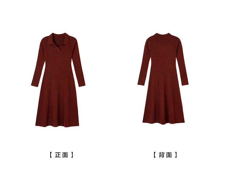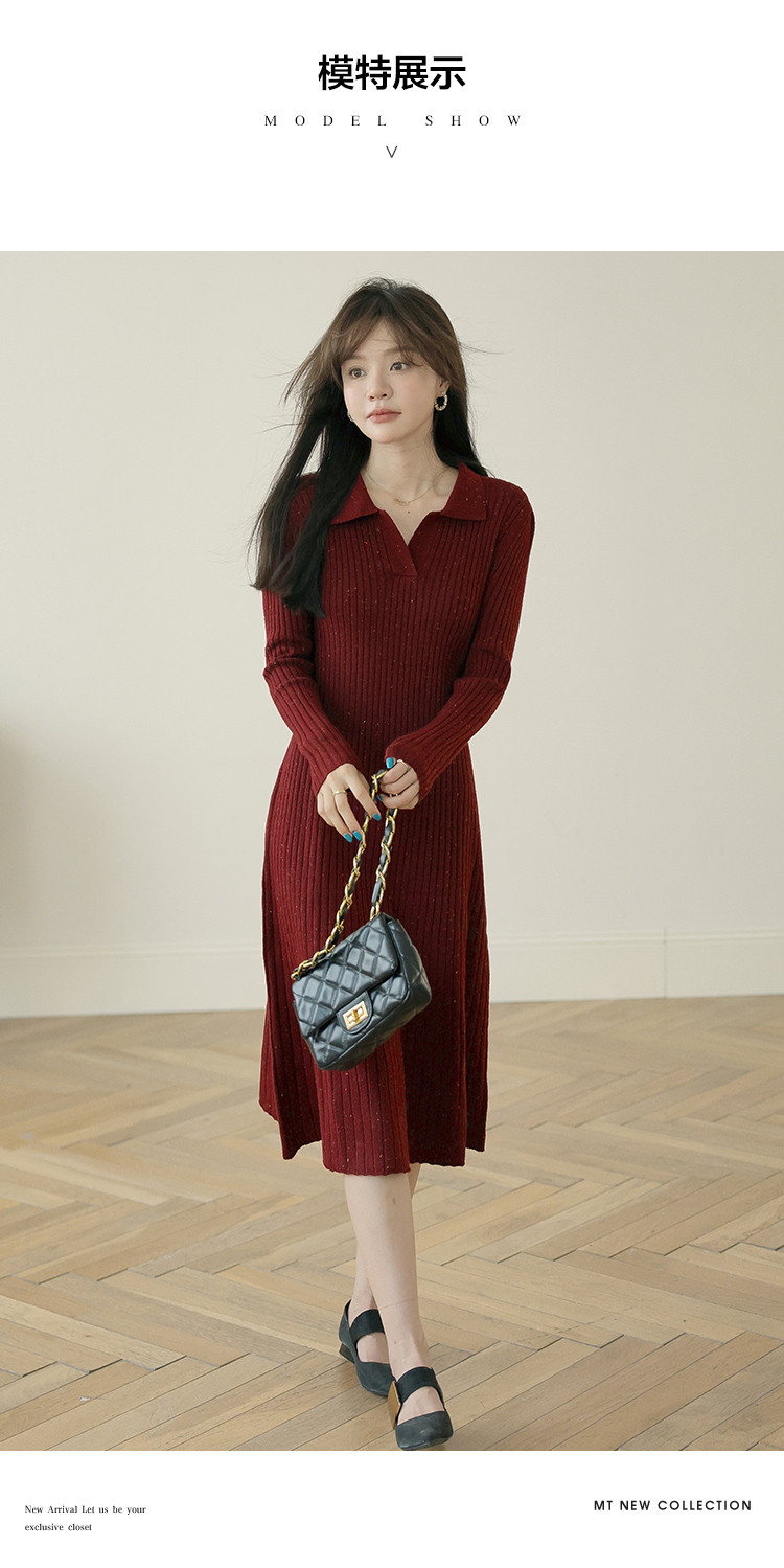 【曲线回廊】秋法式智感V字翻领舒弹藏肉含绵羊毛连衣裙女长款