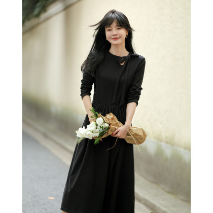 【霞光映日】秋法式文艺镂空绑带复古A字收腰遮肉中长女连衣裙