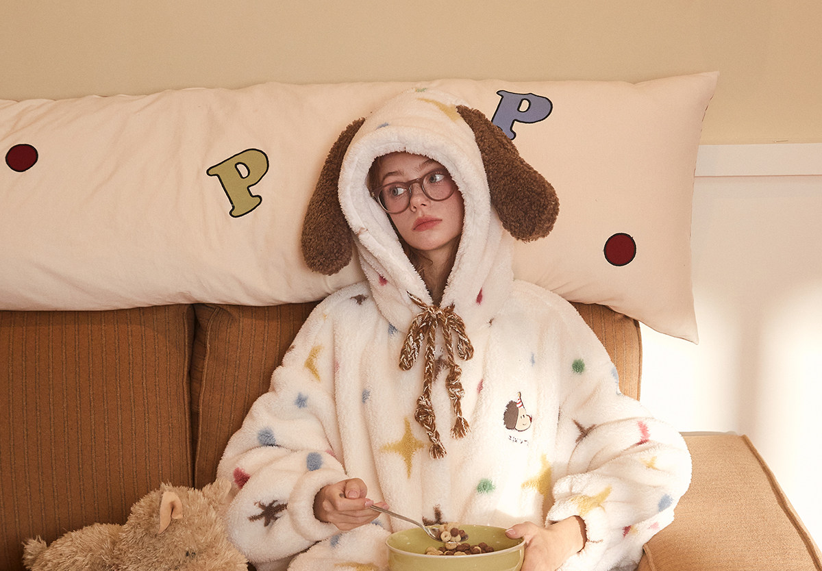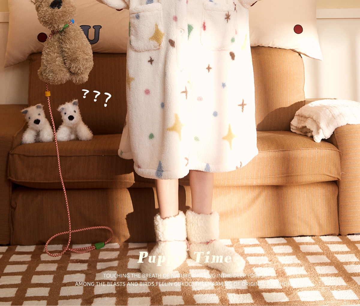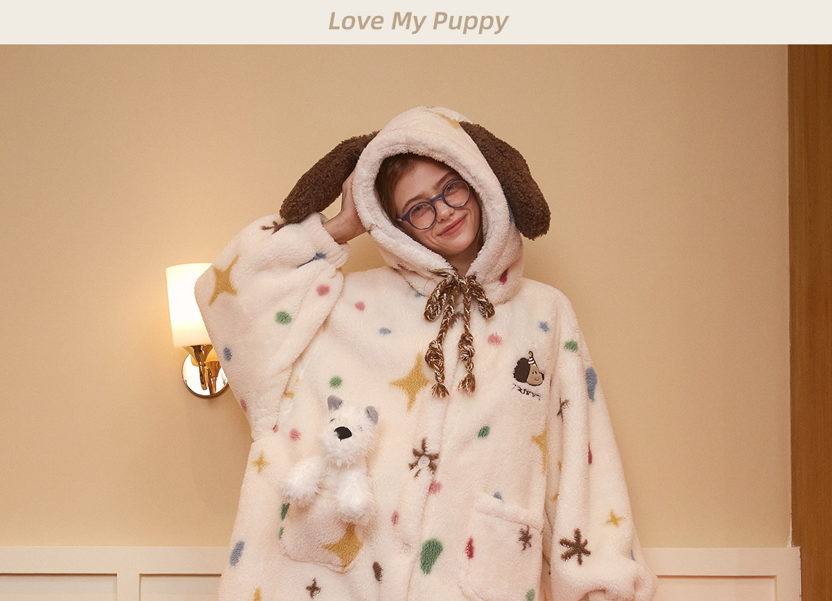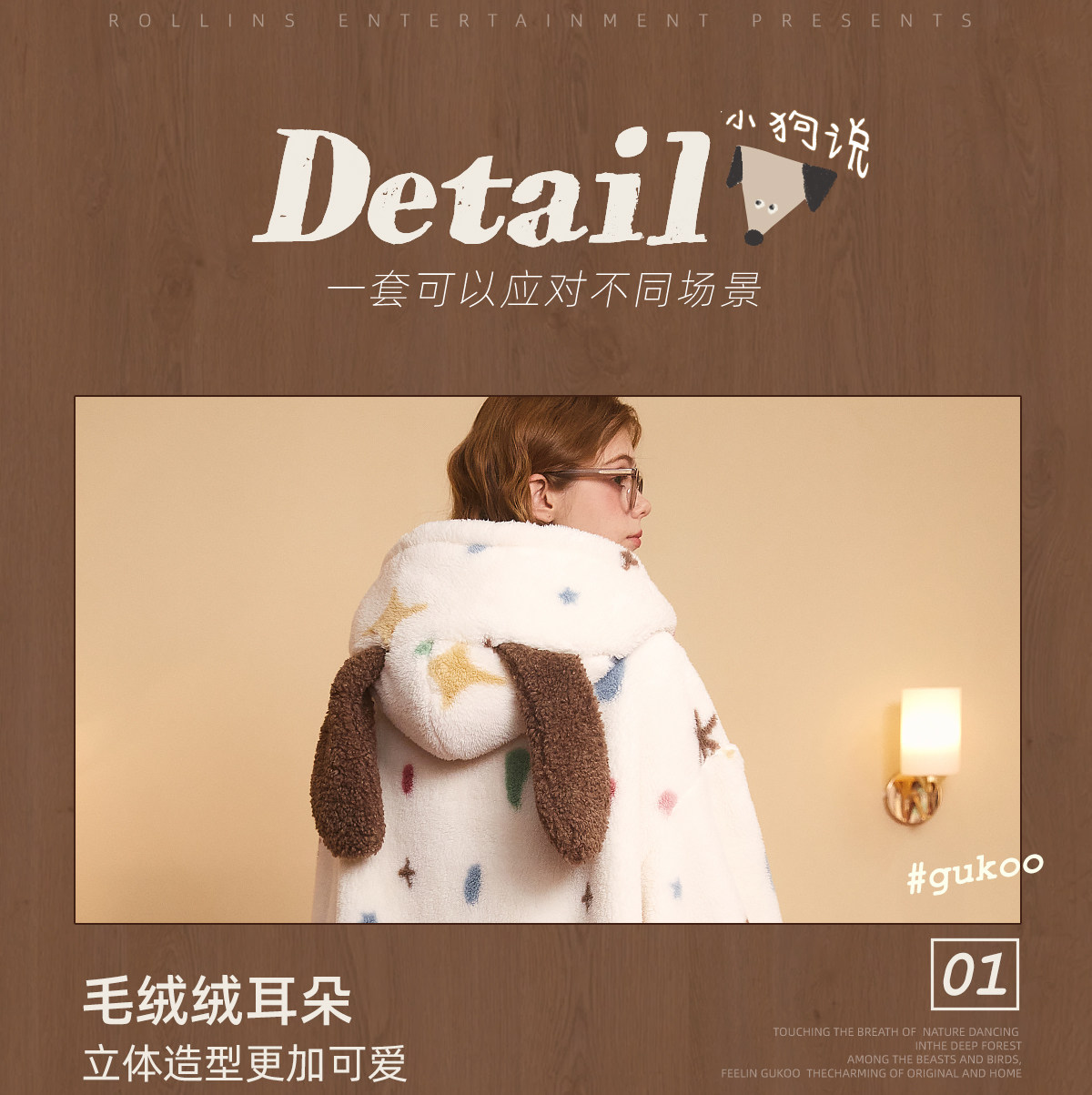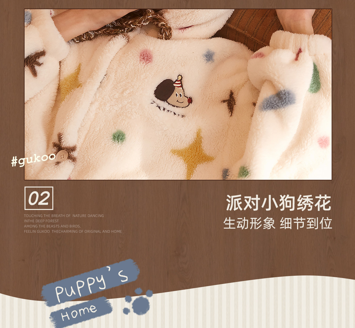 Gukoo/果壳睡袍女冬季轰轰小狗新款满印可爱薄绒女士家居服睡袍D