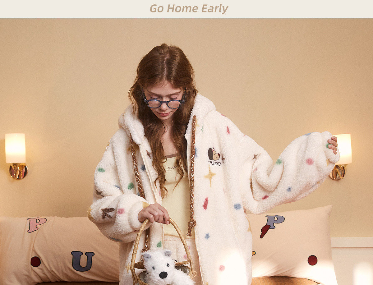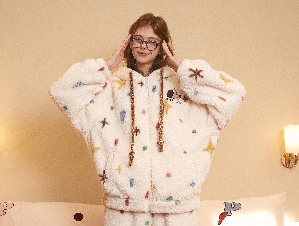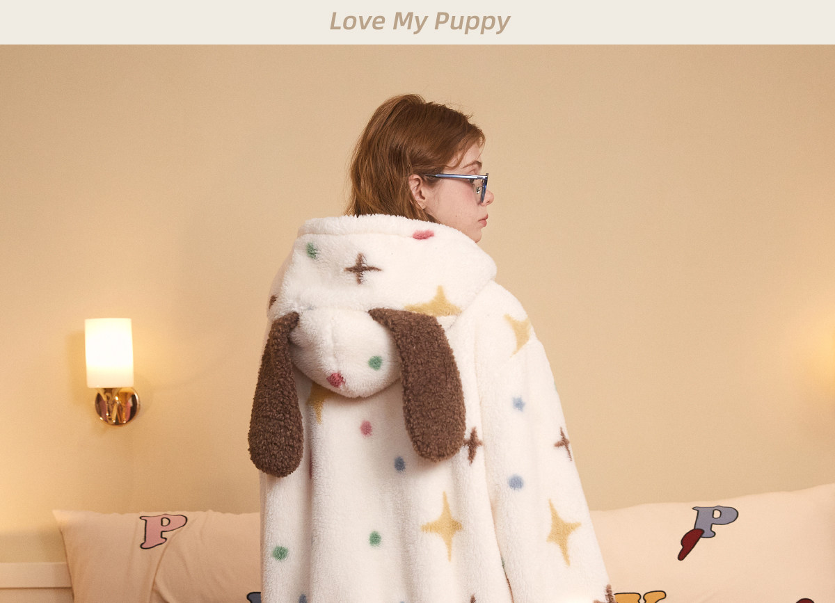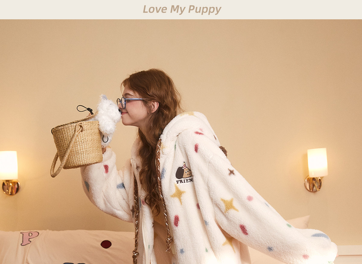 Gukoo/果壳睡衣女冬季轰轰小狗新款可爱毛绒薄绒女士家居服套装D