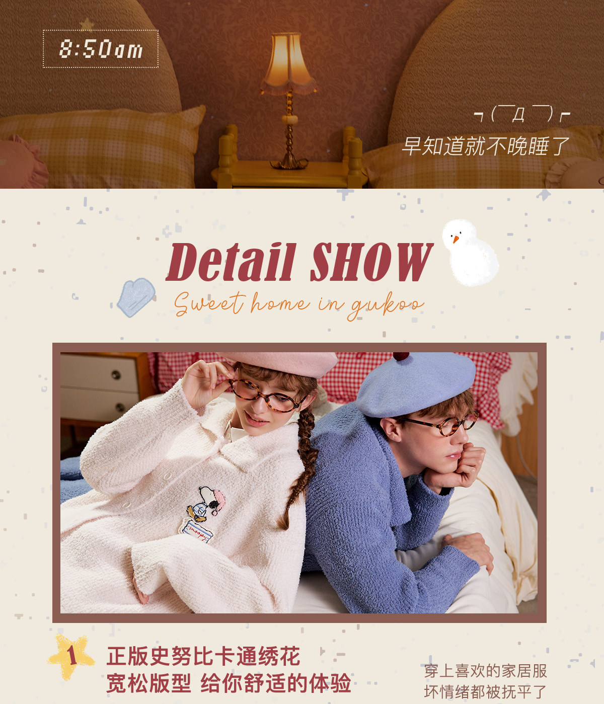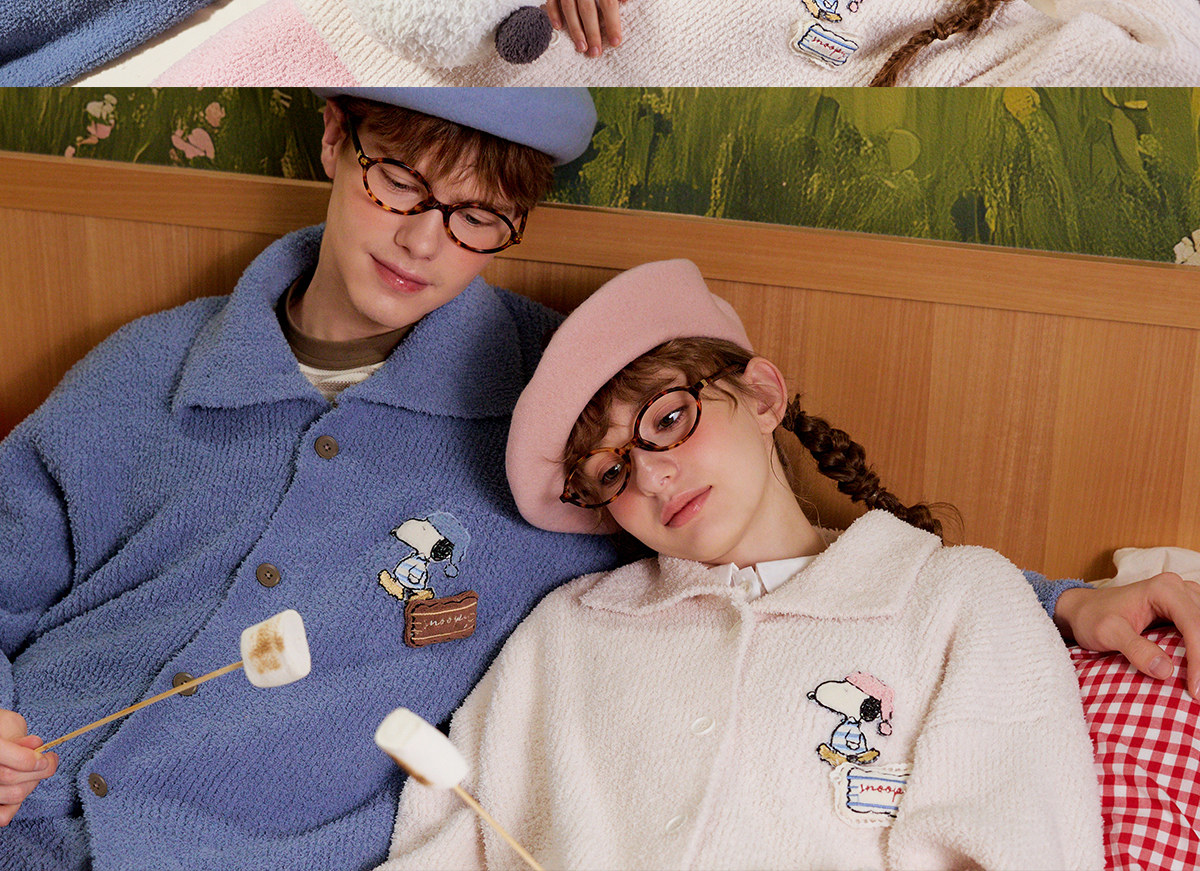 Gukoo/果壳情侣睡衣冬季半边绒保暖新款史努比联名女家居服套装D