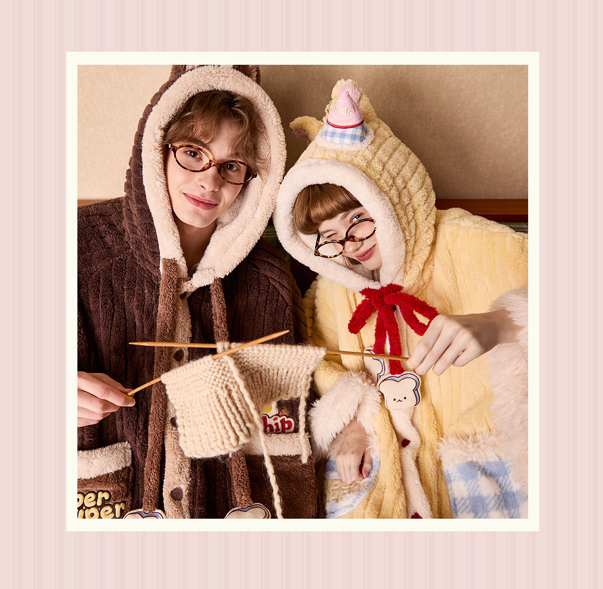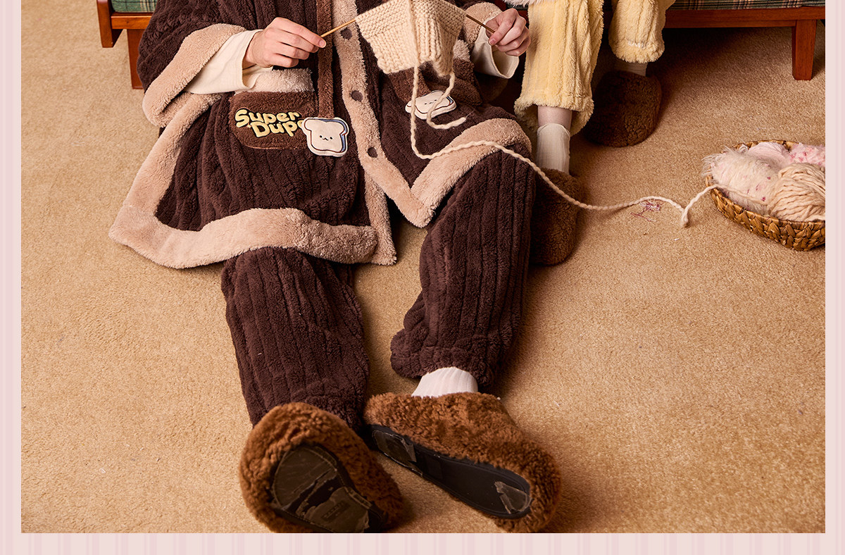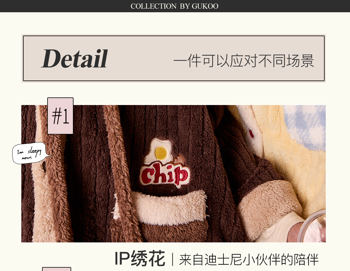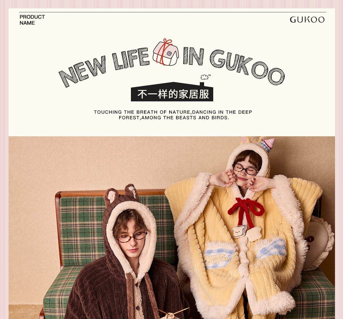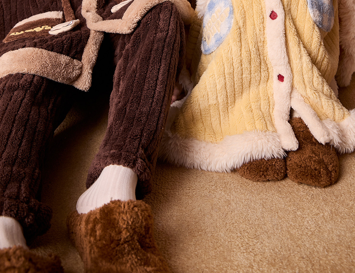 Gukoo/果壳情侣睡衣女秋冬新款奇奇蒂蒂珊瑚绒男士家居服女冬保暖套装D