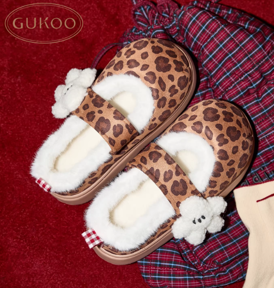 Gukoo/果壳棉鞋女冬季保暖可爱卡通新款米奇豹纹女士居家棉鞋