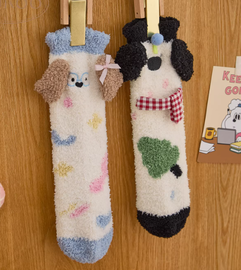 Gukoo/果壳中筒袜冬季保暖新款珊瑚绒袜小狗女士两双装袜子组合