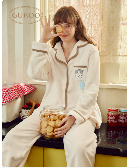 果壳(Gukoo)睡衣女冬季鲨鱼猫联名毛绒保暖简约翻领女士家居服套装 牛乳白