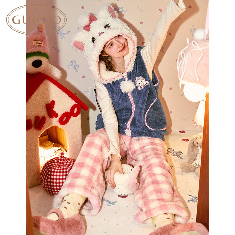 Gukoo/果壳冬季迪士尼玛丽猫卡通联名马甲连帽加厚家居服套装