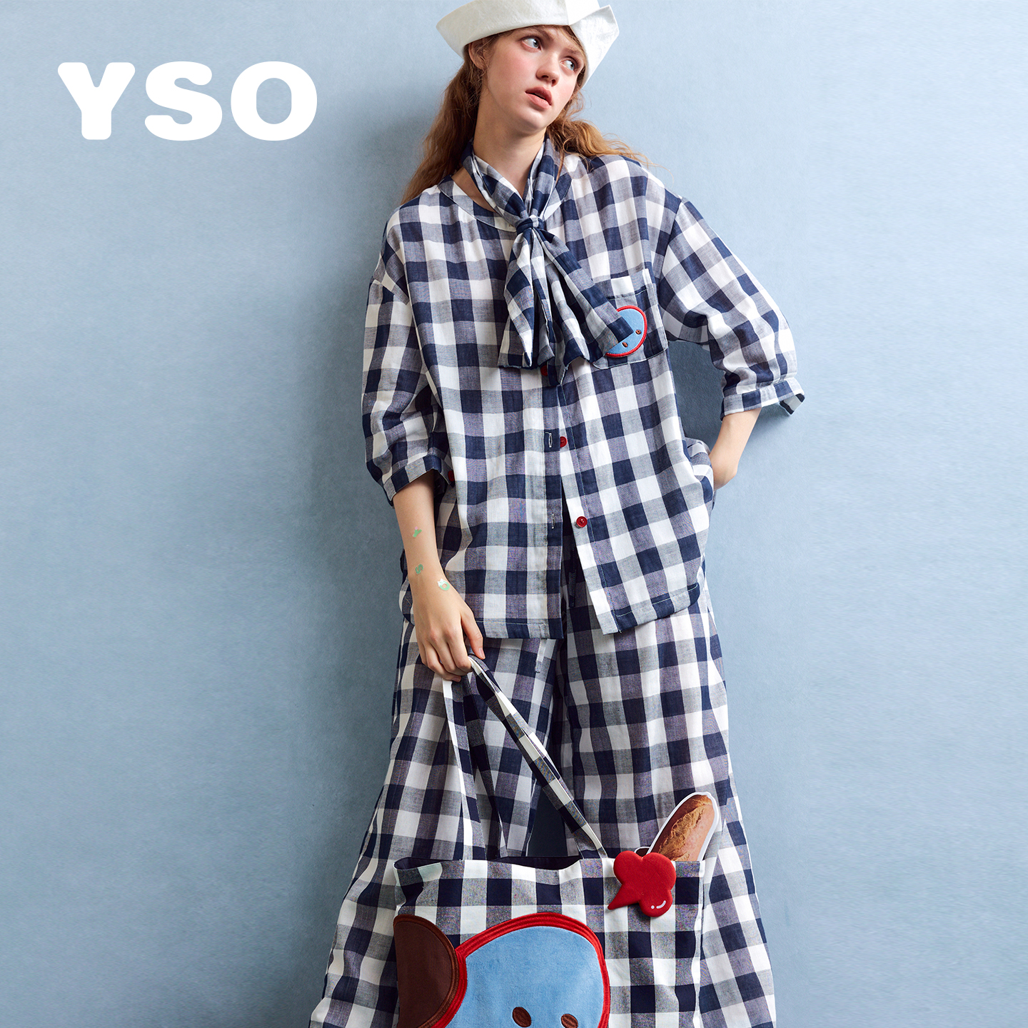 yso【酷猫系列】睡衣女春夏款复古格纹双层纱宽松文艺家居服套装A
