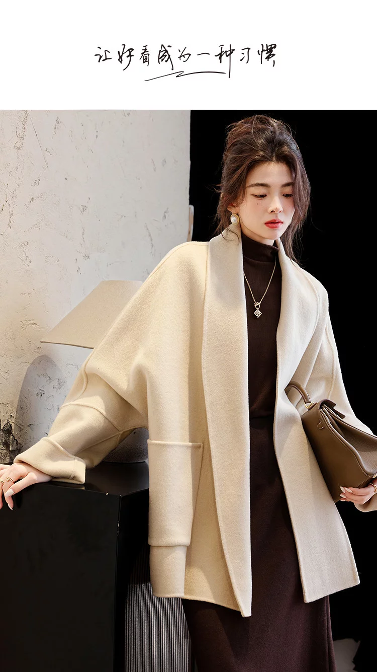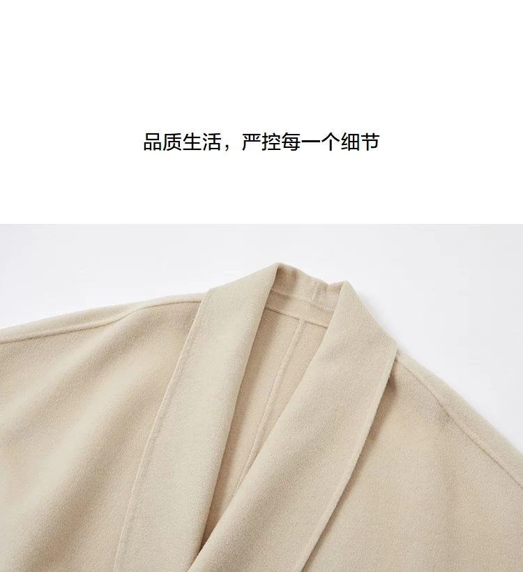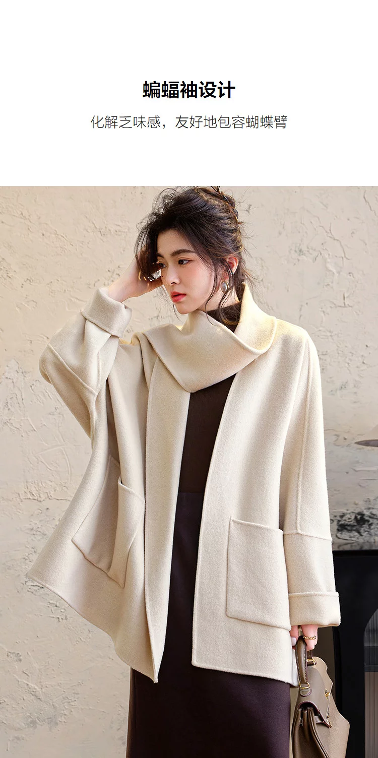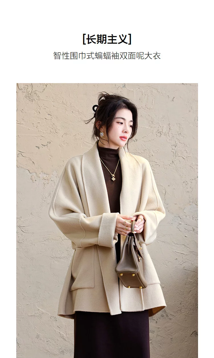 德玛纳【含羊驼毛绵羊毛】冬季智性围巾式开襟蝙蝠袖双面呢大衣女外套G540420850101838
