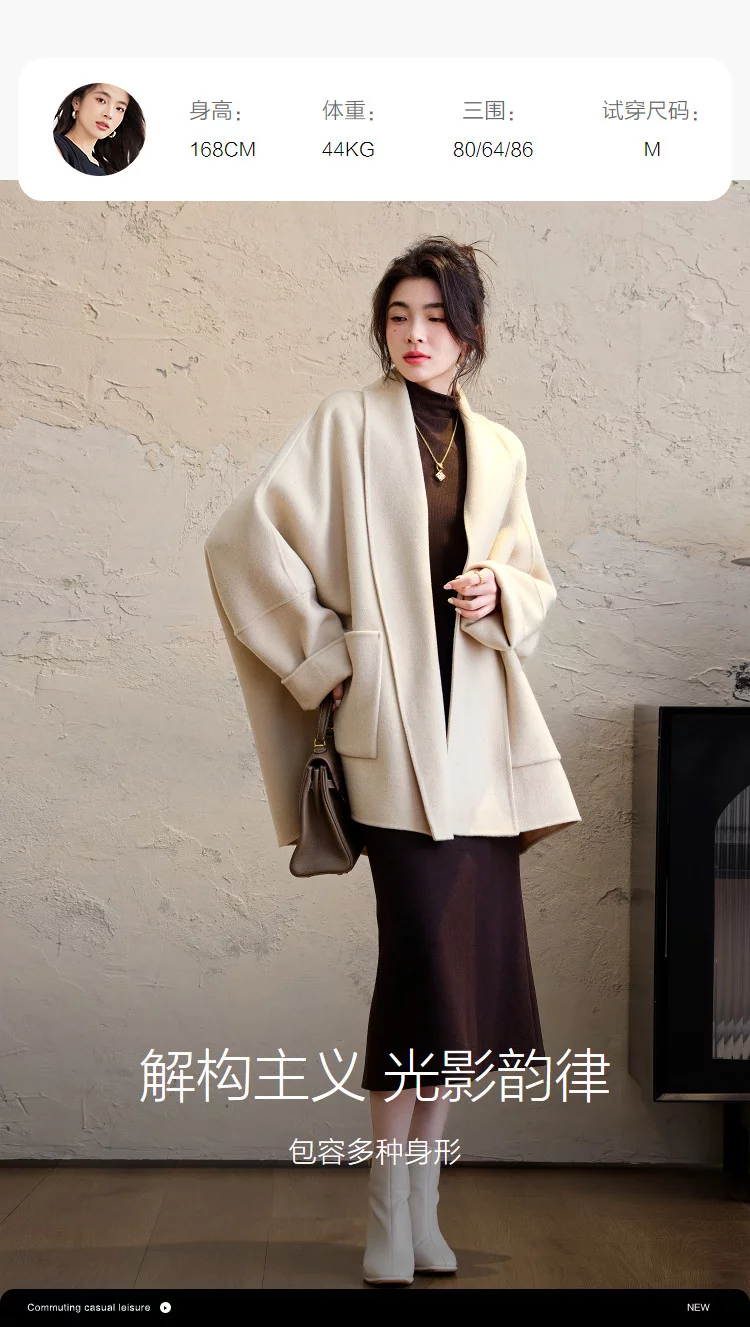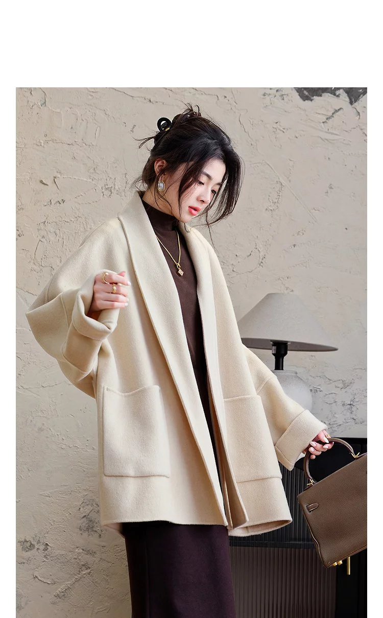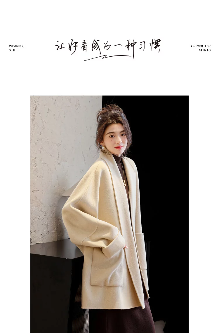 德玛纳【含羊驼毛绵羊毛】冬季智性围巾式开襟蝙蝠袖双面呢大衣女外套G540420850101838