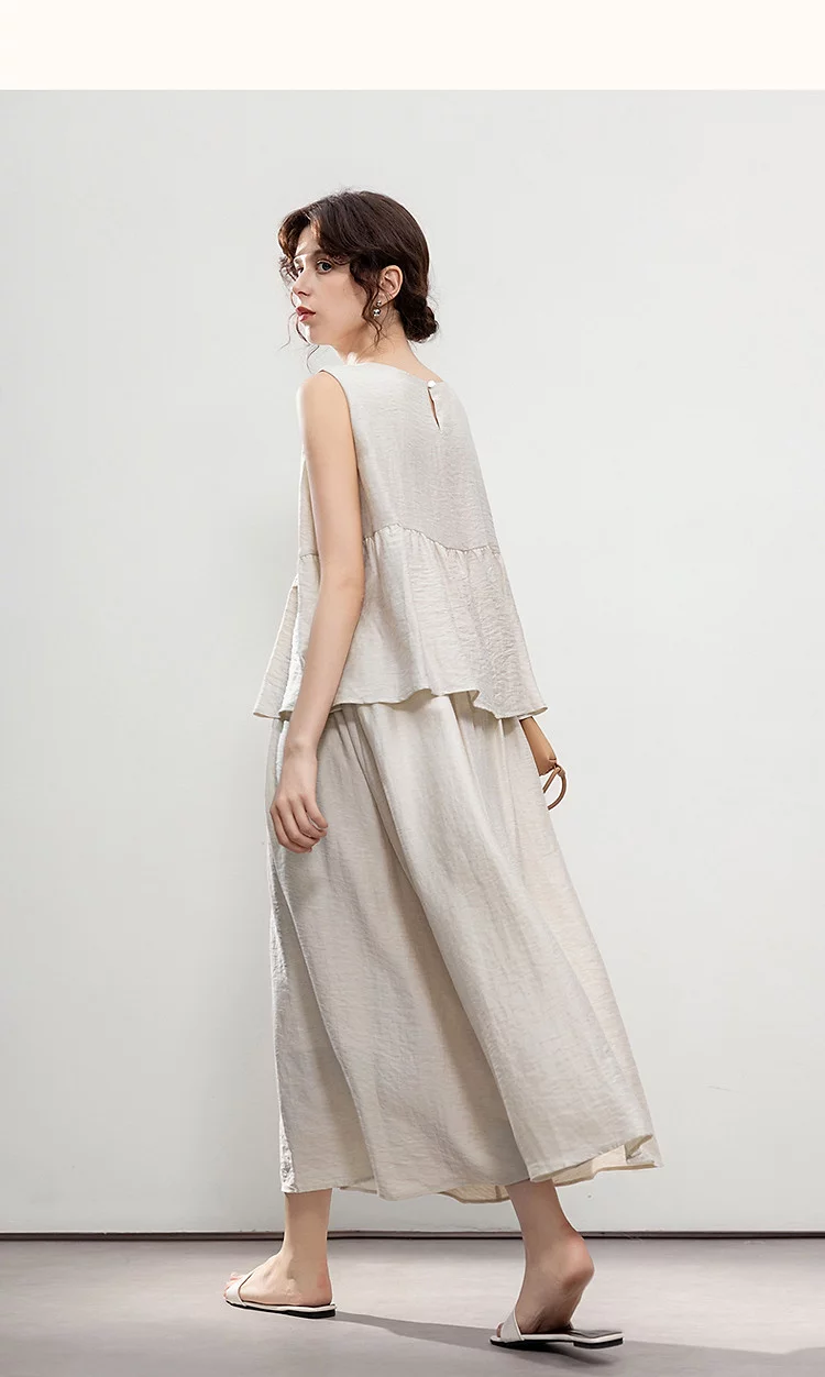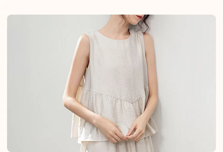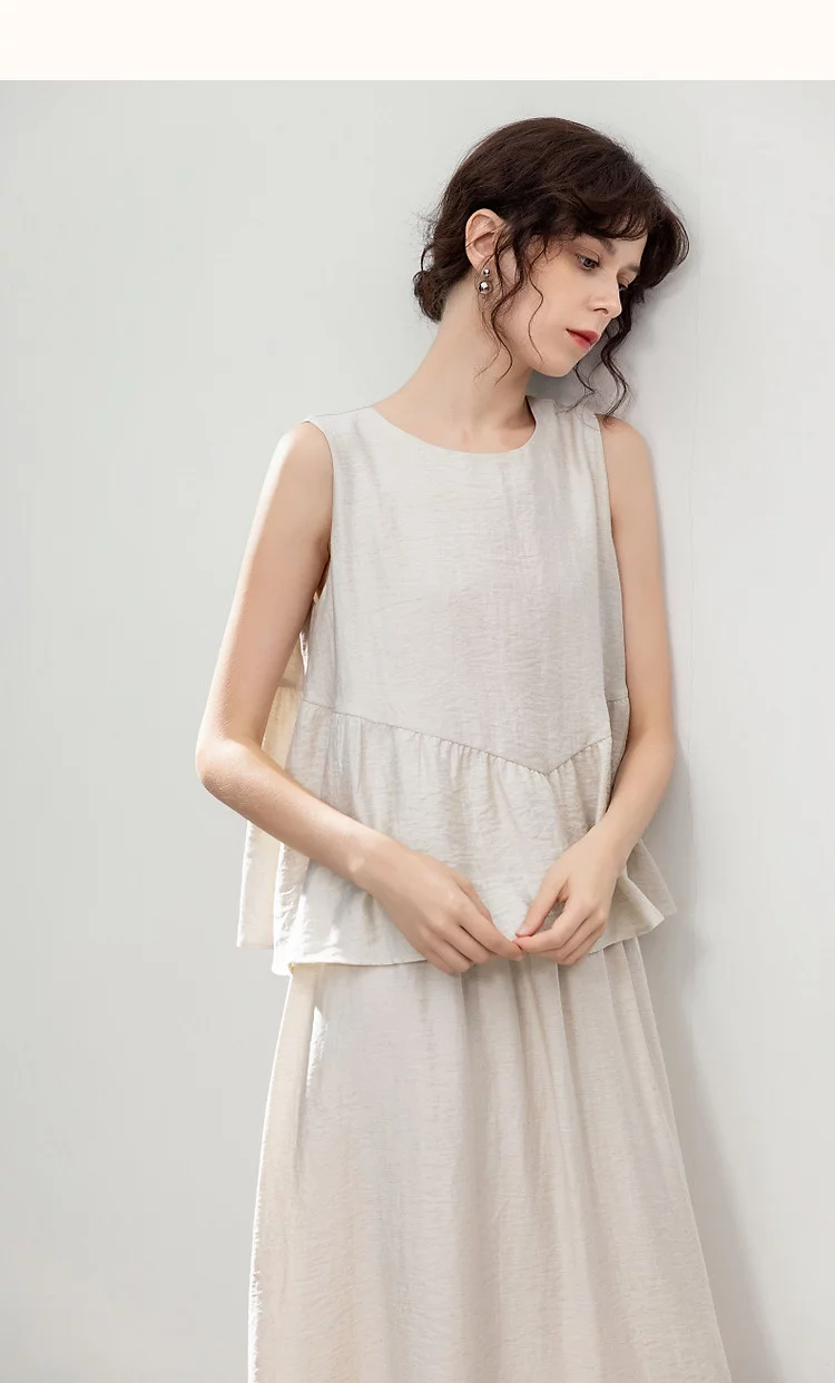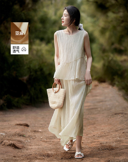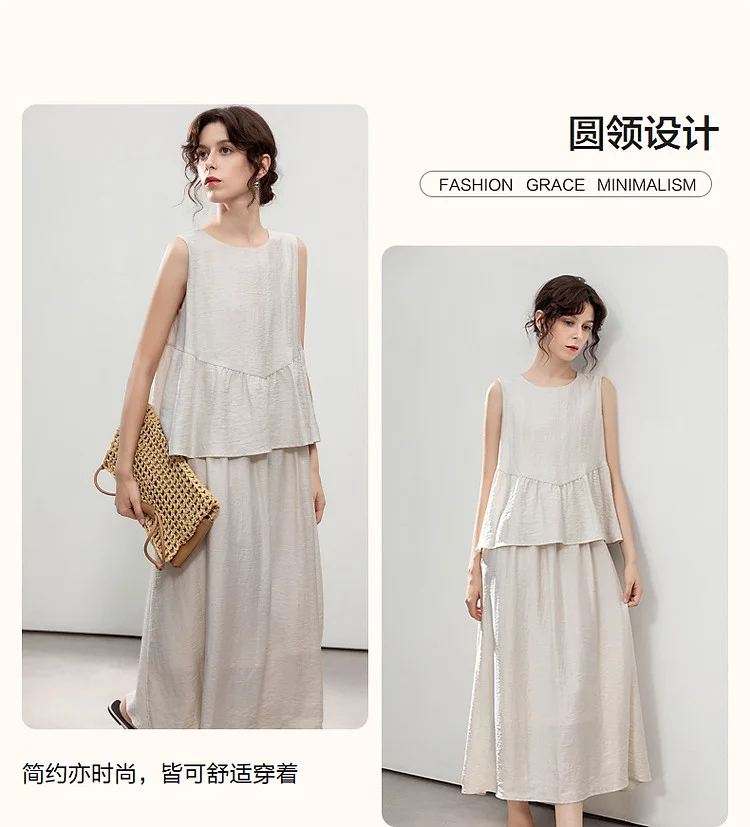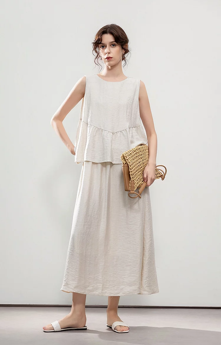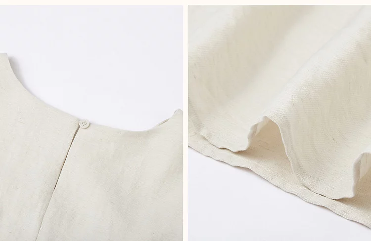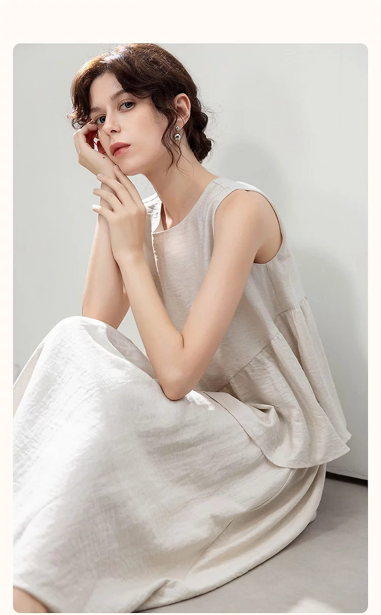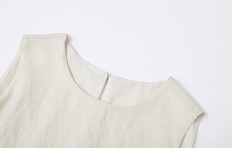 德玛纳【含自然风亚麻】夏季设计感拼接假两件无袖露肩水滴扣蛋糕连衣裙G541221550101